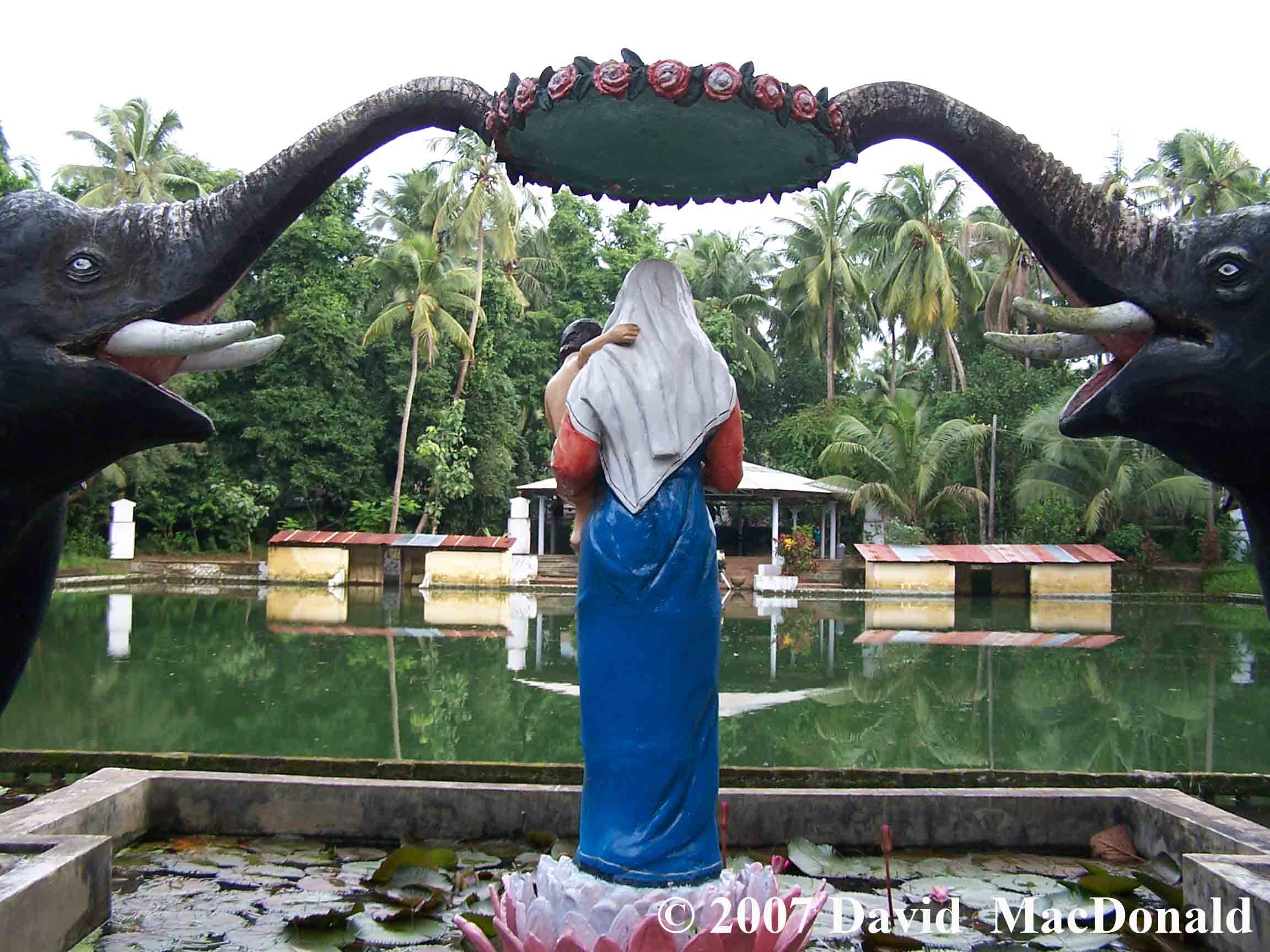 The site in Southern India where Thomas the Apostle landed in 52 AD. He lived there until 72 AD when he was martyred. This is where he baptised natives and performed the famous miracle. Natives were throwing water in the air to their gods. Thomas said, "it appears your gods are not accepting your offer because the water is falling back down". Thomas threw water in the air for Jesus, and it just stayed there. There was a mass conversion to Christ which is still going on in the south of India. Notice the distinctly Indian flavour of the honour they give to Mary.