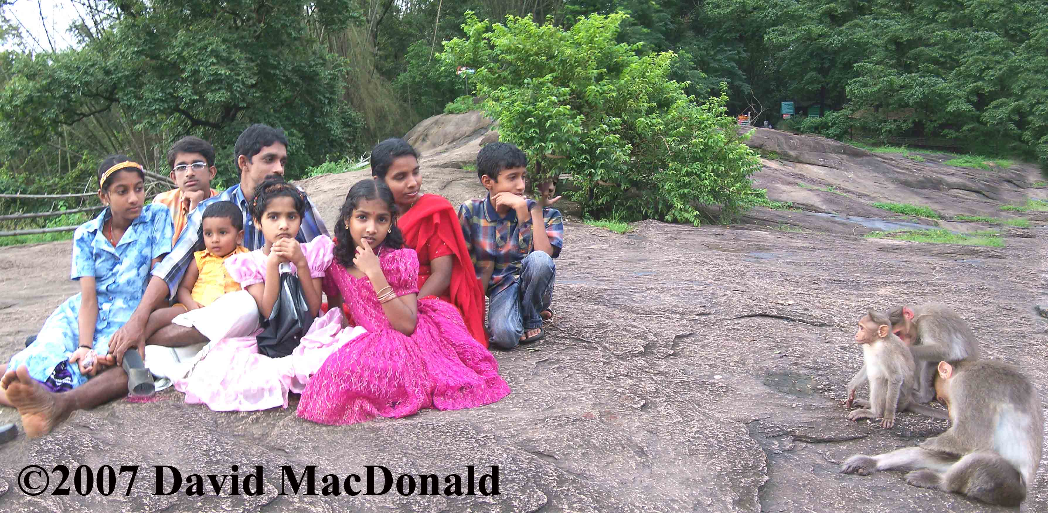 This family of monkeys are hanging out near a family picnic. The only thing that worries me is that the girl in the pink dress thinks I am more bizarre to look at than the monkeys.